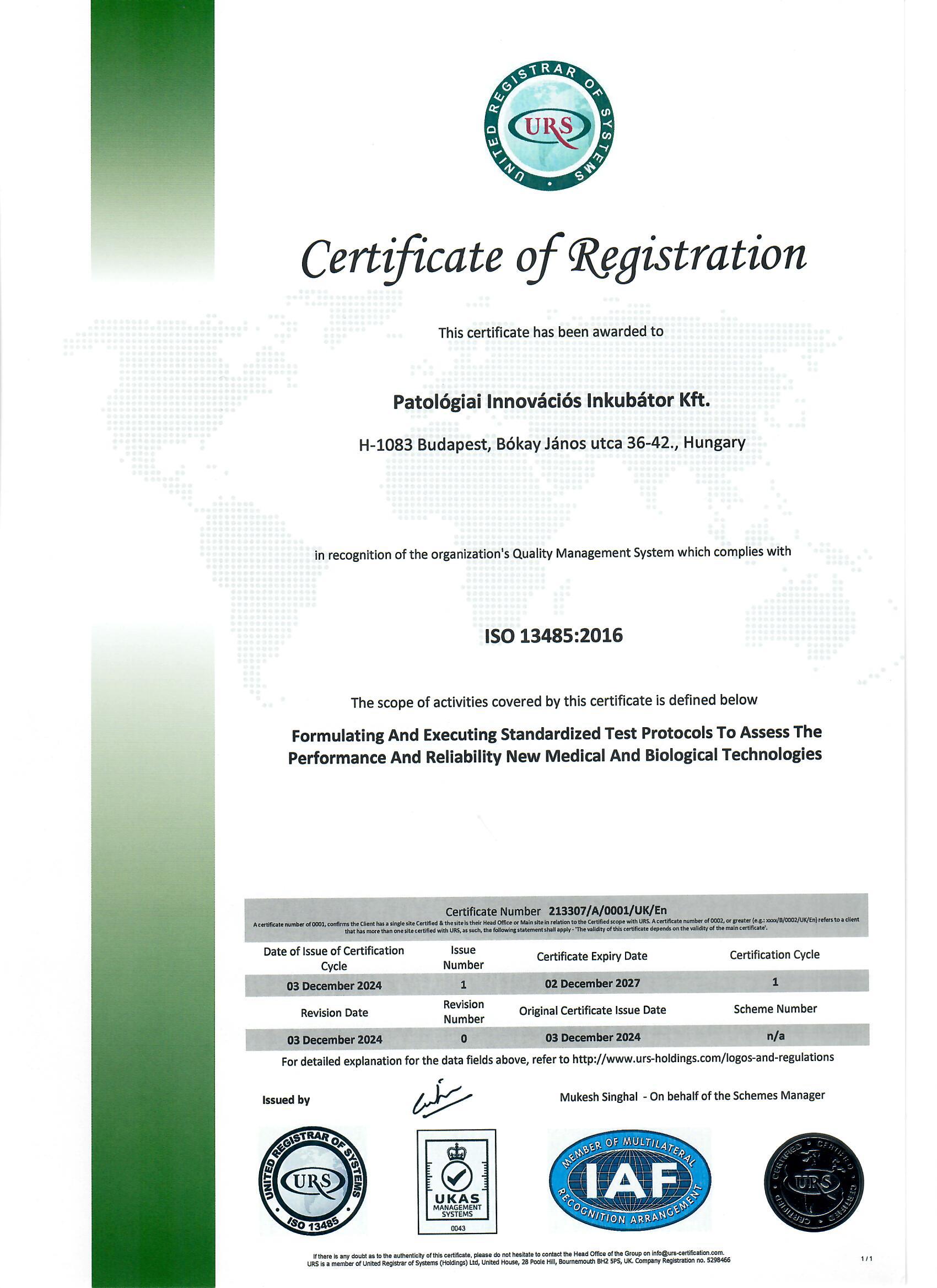 A Patológiai Innovációs Inkubátor Kft. elkötelezett a minőségi elvárások teljesítése és a szabványok betartása mellett, amit az ISO 13485 tanúsítvány megszerzése és fenntartása hitelesen igazol.